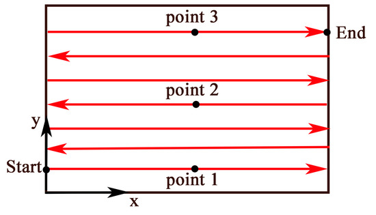 Laser scanning arrangement in the simulation program (Point 1: midpoint of the first scanning line; Point 2: the midpoint of the fourth scanning line; and Point 3: midpoint of the last scanning line).