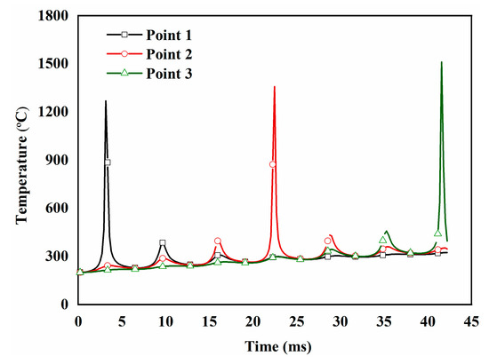 Figure 4 presents the curve of temperature change with time at monitoring Points 1–3, using v (200 mm/s) and P (180 W) The temperature at these monitoring points rises rapidly with the proximity of the laser source and falls sharply with the departure of the laser beam. The peak value of the thermal cycle curve of each monitoring point appears periodically. The peak value appears at the monitoring point where the laser is acting, and the subsequent peak value appears at the monitoring point where the laser acts on the adjacent scanning channel. The maximum peak temperature of the three monitoring points is 1268.6, 1357 and 1510.4 °C, respectively. The thermal cycle curve shows that the metal powder undergoes the process of melting, cooling and solidification. Due to the thermal accumulation of heat from the former channel to the latter channel, the peak temperature of the adjacent monitoring points is increasing.