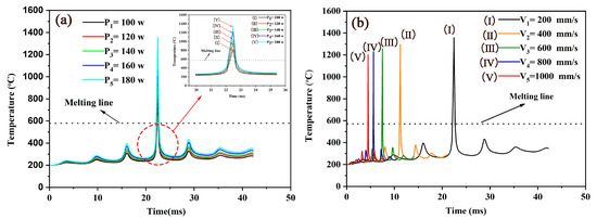 The temperature variation with time in the AlSi25 powder SLM process (Point 2): (a) different P (v = 200 mm/s); and (b) different v (P = 180 W).