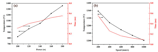 The maximum temperature and the existence time in the AlSi25 powder SLM process: (a) different powers (v = 200 mm/s); and (b) different laser speeds (P = 180 W).