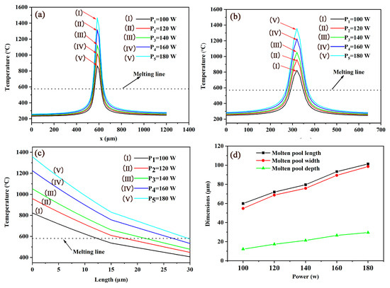Figure 7a–c, respectively, shows the temperature distribution along the x-axis (parallel scanning direction), y-axis (vertical scanning direction) and z-axis when the laser spot center falls at Point 2 at v of 200 mm/s and different P of 100, 120, 140, 160 and 180 W. By the intersection distance between the melting line and each curve, the dimension of the molten pool using different P can be obtained. When P is 100 W, the length, width and depth of the molten pool are 59.93, 54.79 and 12.18 μm, respectively. Increasing P to 140 W, the length, width and depth of the molten pool increase by 33%, 38% and 74%, respectively. When P is increased further to 180 W, the length, width and depth of the molten pool is increased to 101.35, 98.6 and 29.51 μm, respectively. It can be concluded that increasing P can increase the dimensions of the molten pool (Figure 7d).