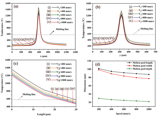 Figure 8a–c shows the temperature distribution along the x-axis (parallel scanning direction), y-axis (vertical scanning direction) and z-axis when P is 180 W and the scanning speed is 200, 400, 600, 800 and 1000 mm/s, respectively, with the laser spot center falling at Point 2. With the increase of scanning speed, the molten pool keeps on decreasing (Figure 8d). When v (200 mm/s) is relatively low, the length, width and depth of the pool are 101.35, 98.6 and 29.51 μm, respectively. When v is increased to 600 mm/s, the length, width and depth of the pool reduce to 91.55, 83.54 and 24.77 μm, respectively. When the speed is increased to 1000 mm/s, the length, width and depth of the pool decrease to 87.38, 77.34 and 21.88 μm, respectively.