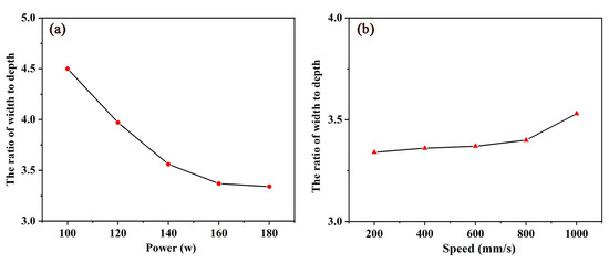 The width/depth ratio of the molten pool changes under different process parameters: (a) v = 200 mm/s is fixed; and (b) P = 180 W is fixed.