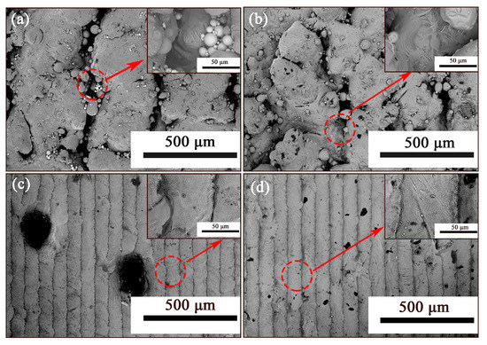 Figure 10 shows BSEM micrographs of the AlSi25 specimen cross-section prepared by SLM under different P. It can be observed that SLM has the characteristics of single-pass scanning and stacking, and there are obvious melting traces between lanes. The temperature of the formed molten pool is relatively low (822.91 °C) and its width is relatively narrow (54.8 μm) with a constant P of 100 W (Figure 6a). Therefore, the amount of liquid produced by AlSi25 is also extremely small, which leads to the layer-to-layer test. Large grooves appear in the cross-section of the sample. Since the melting depth is very shallow, this results in incomplete melting of sintered powder particles that span multiple molten layers (Figure 10a). Several irregular micro-holes are scattered on the surface of the sample when P is fixed at 120 W. The gullies in the region where the tracks meet are decreasing, and the powder in the gullies is almost melting (Figure 10b). On increasing P to 140 W, an intact surface morphology of SLM samples can be obtained. There are almost no gullies in the cross-section, and there are no obvious unfused marks between the channels, but with large holes (Figure 10c). A denser sample can be obtained, and the holes in the cross-section become smaller at P of 160 W (Figure 10d).