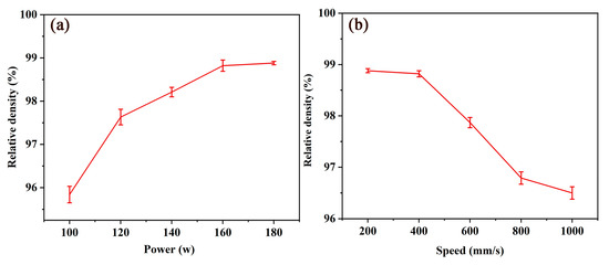 Variation of SLM sample relative density under different parameters: (a) using different P (v = 200 mm/s); and (b) using different v (P = 180 W).