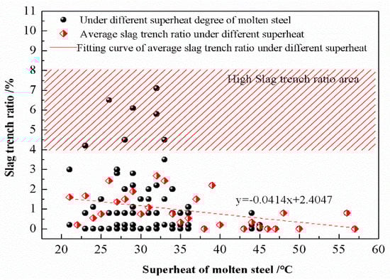 As an important parameter to measure casting in continuous casting, the superheat of molten steel will affect the stability of the casting process. When the superheat is too high, the number of casting sequences in a tundish is shortened, which places a burden on the cooling stage of the continuous casting mold and yields internal billet quality problems [12,13,14,15]. In contrast, when the superheat is too low, the temperature of molten steel is close to the liquidus temperature of the steel, it is easy to cause molten steel nodulation, which is not conducive to the floating of inclusions [16]. The direct effect of superheat on the slag trench ratio of the billet has rarely been reported. To analyze whether there is a relationship between the superheat degree and the generation of SWRH82B slag trench ratio, data statistics of the proportion of slag spot to total slag spot for different superheat degrees of the 73 heats SWRH82B steel that was produced at the plant from November to December 2018 were used, as shown in Figure 2.