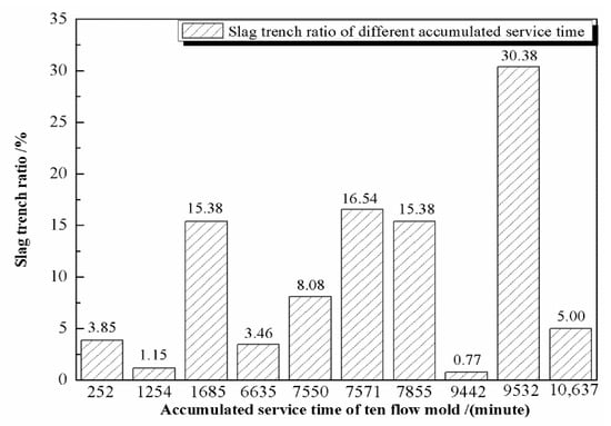 With a continuous increase in the amount of steel passing through the mold, the mold exit will gradually wear out, so the reverse taper of the new mold is larger than that of the middle and later molds. However, because of the small shrinkage of the SWRH82B high-carbon steel, the gap between the mold wall and the shell is small [17,18]. Theoretically, a large reverse taper of the new mold can easily lead to uneven flow of liquid slag into the gap, and the channel will be blocked to form a slag rim, which is more likely to cause slag spots. To study whether a correlation exists between the accumulated service time of the mold and the slag trench ratio, the relationship between the accumulated service time of ten flow molds of a certain pouring time of SWRH82B and the slag trench ratio was analyzed statistically, as shown in detail in Figure 3.