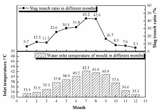 Because of the cooling capacity of the cooling tower, the inlet water temperature of the mold of this plant was affected significantly by the climate in different months. To analyze the relationship between the inlet water temperature of the mold and the slag trench ratio, the relationship between the inlet water temperature of the mold and the slag trench ratio from January to December 2018 was calculated statistically, as shown in Figure 4.