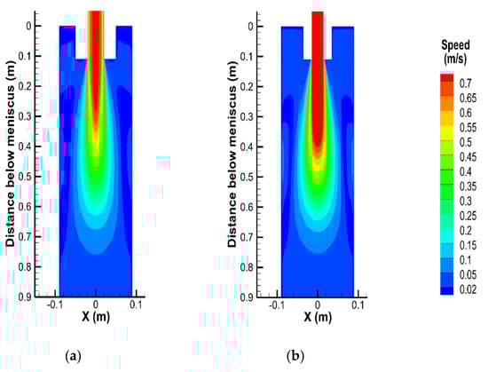 The comparison of flow speed in Figure 5 shows that when the inner-outer nozzle diameter changes from 40–100 mm to 30–70 mm, the flow velocity at the outlet of the nozzle increases from 0.65 to 0.70 m/s at the same constant flow rate, the flow velocity at the lower side of the outlet exceeds 0.30 m/s. the jet flow velocity increases and the flow field near the liquid surface becomes active. The impact depth of the main molten steel stream from the nozzle is ~600 mm.