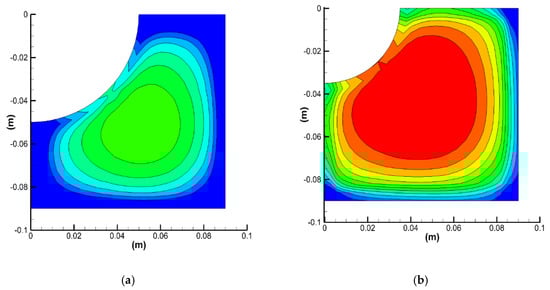The comparison in Figure 6 shows that under the same working conditions, when the inner–outer nozzle diameter changes from 40–100 mm to 30–70 mm, the area above 1738 K at the meniscus was enlarged visibly and the maximum temperature increased by ~2 K. This corresponds with the increase of active area distribution of the flow field near the meniscus in Figure 5. For the active area, the high-temperature liquid steel from the nozzle is replenished with time and the meniscus temperature remains high.