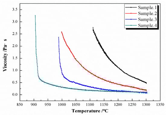 As an important functional material in continuous casting, proper physical and chemical properties of the mold powder are key to improving the continuous casting efficiency and the surface quality of the billet [24,25,26,27]. Due to the relatively high melting temperature and viscosity of the mold powder of SWRH82B steel, and the small gap between the high carbon steel billet shell and the mold wall, the consumption of SWRH82B steel mold powder in the plant is ~0.189 kg/t on average during production and application, whereas the normal consumption of SWRH82B steel mold powder should exceed 0.3 kg/t. Too low a consumption of mold powder will lead to a poor lubrication effect of the billet, easy agglomeration and the formation of slag spots. The thickness of the liquid slag layer that was measured on site varied from 6 to 7 mm, which is lower than the normal standard of ~10–12 mm. This occurs because the melting point and viscosity of the mold powder were relatively high. The liquidus temperature of the high-carbon steel was too low, and the pouring temperature of the molten steel was lower than other steel grades, which is not conducive to mold powder melting, so the liquid slag layer thickness of the mold powder was relatively low. The physical and chemical properties of the original mold powder cannot meet the requirements for the use of SWRH82B steel. It is necessary to optimize the physical and chemical indices of the mold powder to improve the lubrication effect of the billet. A reasonable reduction of viscosity and melting temperature of the mold powder and several optimization tests were carried out to obtain the most suitable physical and chemical parameters of the mold powder. The application test results of the mold powder with different physical and chemical parameters are shown in Table 2, in which No. 1 is the original SWRH82B steel mold powder for comparison, and No. 2–4 is the improved mold powder. The viscosity temperature curves of the four slag samples are shown in Figure 7.