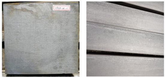 The above investigation results show that an increase in the cooling strength of the mold, a promotion of the melting of the mold powder, and the lubricating effect on the billet favor a reduction in the occurrence of slag spots. Based on this information, to resolve the problem of high slag trench ratios of SWRH82B high-carbon steel in this plant, an optimization of the molten steel superheat, the inlet water temperature of the mold, the size of the submerged nozzle and the physical and chemical properties of the mold powder were proposed. The superheat of the molten steel was adjusted from 20–50 °C to 30–35 °C, the inlet water temperature of the mold was stabilized at 33–35 °C, the inner and outer diameters of the submerged nozzle were adjusted from 40–100 mm to 30–70 mm, the viscosity and melting temperature of the mold powder were adjusted from 0.45–0.55 Pa·s, 1100–1140 °C to 0.15–0.25 Pa·s, 1020–1060 °C. After stable production and application, the surface quality of the SWRH82B steel billet was improved significantly, the slag trench ratio was reduced from 40–50% to less than 1%, and the yield of rolled products was increased from 81% to 95%. Figure 8 shows the surface quality of SWRH82B high-carbon steel billet after improvement. The surface is smooth and the vibration mark is relatively flat and regular.
