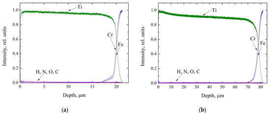 In Figure 8a,b, there was a hydrogen peak at a depth of 18 μm. This was caused by the diffusion movement of hydrogen to the substrate. It is known that the interface between the coating and the substrate is the place with the greatest structural incoherence. In such places, hydrogen is energetically beneficially distributed. The appearance of the hydrogen peak with a width of about 5 µm near the substrate was apparently due to two reasons. The first reason is that the substrate was not a hydride forming material and the hydrogen diffusion rate in steel is several orders of magnitude lower than in titanium under experimental conditions. This led to hydrogen accumulation near the substrate-coating interface. The second reason for the appearance of the wide hydrogen peak near the substrate-coating interface was due to the different sputtering rates of materials such as titanium hydride and steel.
