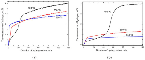 Table 2 shows the values of hydrogen sorption rate and maximum hydrogen concentration that were achieved during the hydrogenation of each sample. The absorption rate was calculated in the initial sections of the sorption curve by approximation.