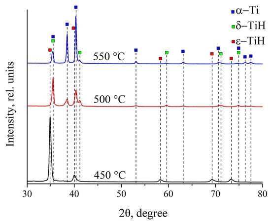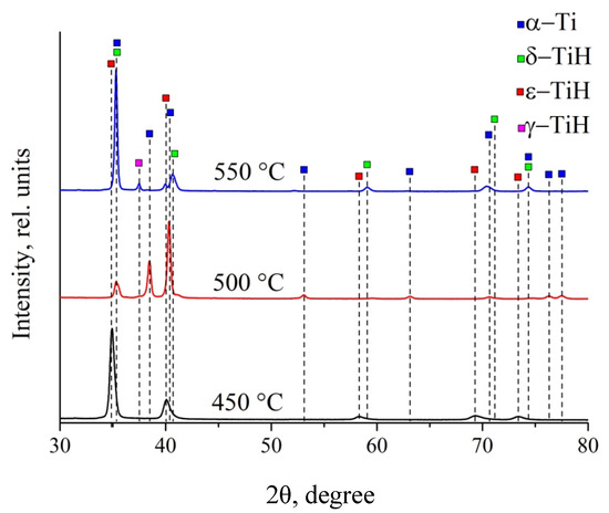 The analysis of diffraction patterns shows the formation of ε titanium hydride with a face-centered tetragonal lattice close to the TiH2 stoichiometric hydride in samples hydrogenated at 450 °C. An increase in temperature to 500 °C leads to the formation of δ titanium hydride and α titanium phases. The temperature increase up to 550 °C is accompanied by the formation of metastable γ hydride, along with δ hydride and α titanium phase.
