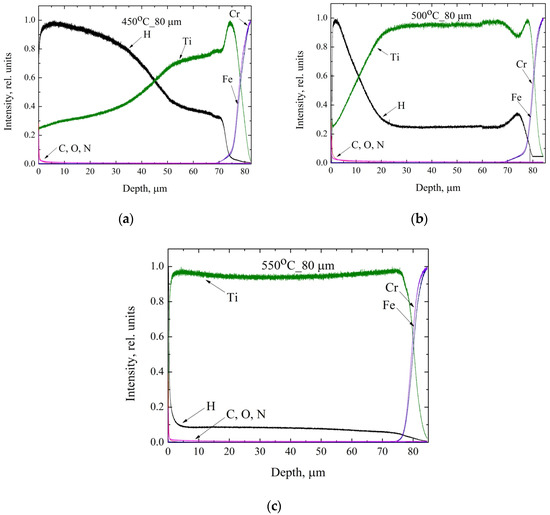 Distribution of elements in the 80 µm Ti coating during hydrogenation at different temperatures: 450 °C (a), 500 °C (b), and 550 °C (c).