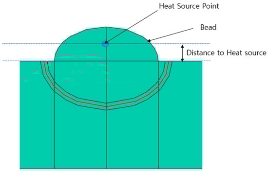This study set the parameters of the Goldak heat source model, weld efficiency, and the location of the heat source as the variables, and identified the parameters when reaching the target values. Although previous studies fixed the heat source point on top of the bead [12,27], the concentration of the heat source occurs in the welding wire in actual welding. Per this configuration, it is difficult to represent the actual phenomenon by fixing the heat source point to the top of the bead in FEM modeling. Therefore, this study defined the heat source point as a variable, which is defined as shown in Figure 2.