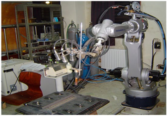 As shown in Figure 5, a welding system with a robot (Samsung, Suwon, Korea) was used for the experiment, by using the backhand welding technique and applying CO2 as the shielding gas [29].
