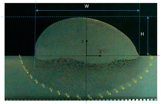 After the welding experiment, the center of the specimen was cut to a size of 40 mm × 20 mm with a wire cutting machine to observe the dimensions of the HAZ. Polishing was performed using 3% HNO3 and H2O Nital solution, and an optical microscope system was used for a precise measurement. Based on the image, the required data were extracted by coordinating the bead size and the boundary of the HAZ as shown in Figure 6 and Table 4. The bead size was measured to be W = 15.02 mm, H = 4.96 mm.