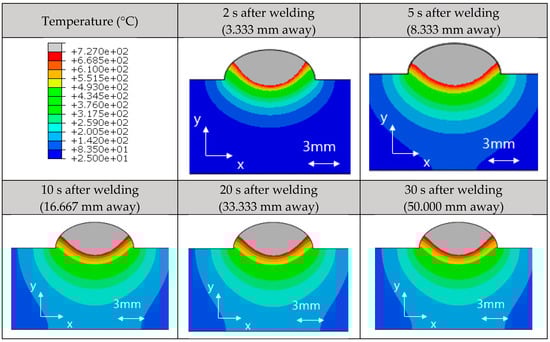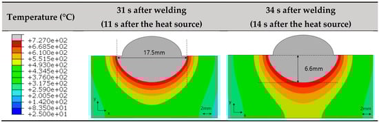 The cross-section in the Z-direction was confirmed by analyzing the results, which was 33.333 mm away from the initial point (20 s after welding). Since the heat source moved at a constant speed, the temperature distribution in each thickness direction was the same with a difference in time after 16.667 mm (Figure 9). In this welding condition, the edge effect did not have an affect after 16.667 mm.