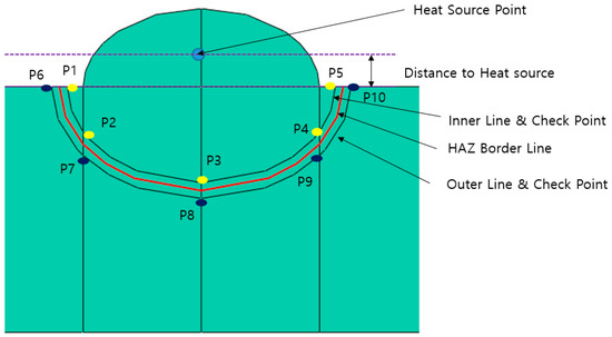 The HAZ temperature was set as the target to determine the Goldak heat source model, which is the main purpose of this study. Figure 11 shows the results of simulating the HAZ border line of the experimental results, where the temperatures of the five check points were examined on each of the inner line and outer line offset 1 mm from the HAZ border line. The points on the inner check line should have a temperature distribution of 727 °C or higher during the welding process, and the points on the outer check line a temperature distribution of 727 °C or lower. The above criteria were set as the target.