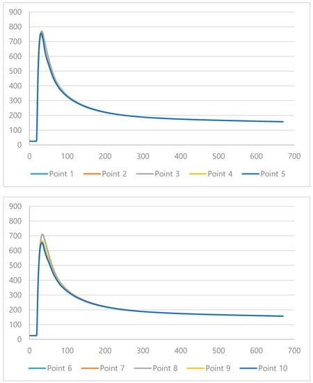 Figure 13 shows the temperature distribution according to the time under the optimal conditions, where all of the points reached maximum temperature 30–34 s after welding (10–14 s after the source point; Table 11). This is because of the time required for heat conduction.
