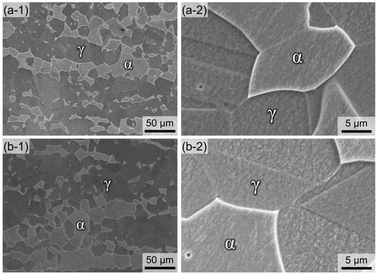 Figure 2a,b exhibit SEM images of the microstructure solution-treated Ni03 and Ni57 alloys, respectively. After the solution treatment, the α and γ phases coexisted in both LDSSs, as shown in Figure 2(a-1),(b-1). The relatively light grey phase was the α phase and the dark grey phase with annealing twin was the γ phase, as marked in the SEM images. In addition, nonmetallic inclusions, which possibly act as initiation sites for localized corrosion [,,], were rarely observed. The magnified SEM images (Figure 2(a-2),(b-2)) show that the precipitations, such as Cr2N and σ, were not observed, even at the grain boundaries in both LDSSs.
