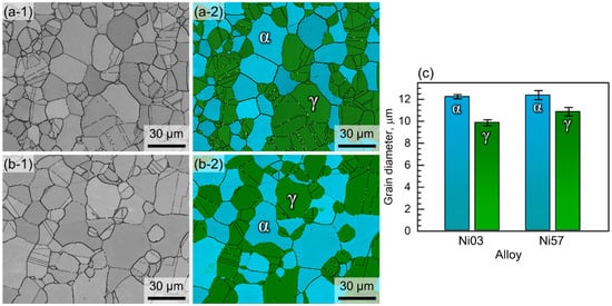 EBSD image quality maps of (a-1) Ni03 and (b-1) Ni57 alloys and phase maps of (a-2) Ni03 and (b-2) Ni57 alloys (green—face-centered cubic (γ) and blue—body centered cubic (α)). (c) Grain diameters of the α and γ phases in the Ni03 and Ni57 alloys.