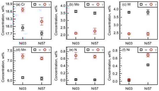 Chemical compositions of (a) Cr (b) Mo, (c) W, (d) Mn, (e) N, and (f) Ni of the α and γ phases in the Ni03 and Ni57 alloys measured using the EPMA.
