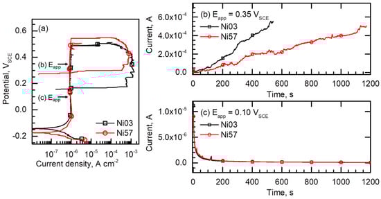 (a) Representative cyclic potentiodynamic polarization curves of the Ni03 and Ni57 alloys chosen from Figure 5a,b. Current–time curves of the Ni03 and Ni57 alloys obtained from potentiostatic tests measured in a 2 M NaCl solution at 40 °C under constant applied potentials (Eapp) of (b) 0.35 VSCE and (c) 0.10 VSCE.