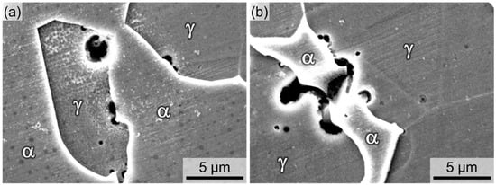 Then, the initiation sites for the pitting corrosion were examined. The Ni03 and Ni57 specimens were immersed in a 1 M HCl + 2 M NaCl solution at 40 °C, and after 30 min of immersion, pitting corrosion occurred in both alloys. Figure 7a,b exhibit the pit morphologies of the Ni03 and Ni57 alloys, respectively. The stable pits, with a size of several μm, were observed at the γ side of the phase boundary for both DSSs.
