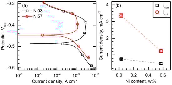 (a) Potentiodynamic polarization curves of the Ni03 and Ni57 alloys measured in a 1 M HCl solution at 40 °C with a potential sweep rate of 0.17 mV s−1. (b) Corrosion rate (icorr) and critical anodic current density (icrit) of the alloys.
