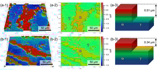Figure 9(a-1),(b-1) show three-dimensional topographic maps of the corroded Ni03 and Ni57 specimens, respectively, after immersion in the HCl solution. It is shown that the two constituent phases are different in corrosion rate in this strong acid solution. In both alloys, the more corroded phase (the blue phase) was the γ phase, which was confirmed by the annealing twins. Then, the dissolution depth of the active phase (γ, in this case) relative to the noble phase (α) could be measured from Figure 9(a-2),(b-2). Analyses on the contour maps revealed that the average corrosion depths of the γ phase relative to that of the α were 0.51 and 0.34 μm for the Ni03 (Figure 9(a-3)) and Ni57 alloys (Figure 9(b-3)), respectively. Thus, Figure 9 indicates that the addition Ni to the Ni03 alloy decreased the galvanic corrosion rate between the γ and α phases.