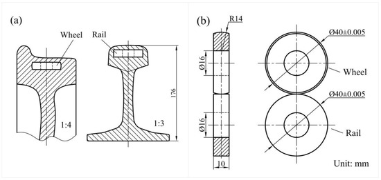 Figure 1. Sampling position (a) and scheme of geometrical contact (b) for the wheel and rail specimens.