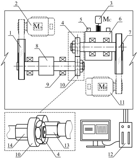Figure 4. Rolling–sliding wear testing apparatus: 1—synchronous belt A; 2—servo motor A; 3—servo motor C; 4—wheel specimen; 5—linear guide; 6—load platform; 7—synchronous belt B; 8—torque sensor; 9—rolling bearing; 10—rail specimen; 11—servo motor B; 12—data acquisition and control system; 13—rotation axis B; 14—rotation axis A.