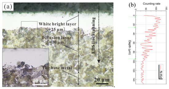 Figure 5. Microstructure observation of nitrided CL60 wheel specimen (a) and distribution curve of N element by EDS line scanning (b).