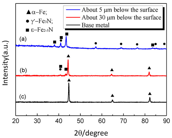 Figure 5a shows the cross-sectional microstructure of the nitride layer of wheel specimen. It can be found that the nitrided specimen consists of a white bright layer, a diffusion layer and the base metal, from the surface to the inside. The white bright layer is formed on the top of the nitride layer, with a thickness of approximately 25 μm—it appears white and bright under the observation of a light microscope. Figure 5b shows the EDS line sweep curve of the N element content distributing along the depth direction. Combining this with the above metallographic analysis, it can be seen that the distribution of nitrogen was consistent with the change in microstructure, i.e., the nitrogen content in the white bright layer was the highest, and the nitrogen element in the diffusion layer gradually decreased in the depth direction. It can be explained by the fact that the iron nitrides content in this layer, such as Fe2-3N, is high. The XRD patterns of the as-received wheel material and nitrided specimens are presented in Figure 6; after the gas nitriding treatment, the surface layer contained strong diffraction peaks of γ′-Fe4N and ε-Fe2–3N phases, indicating the continuous formation of the compound layer. Beneath the white bright layer, there is a relatively thick and hard diffusion layer—its thickness is about 70 μm; the diffusion layer presented the higher phase ratio of α-Fe, γ′-Fe4N and ε-Fe2–3N, which could also be estimated from the XRD results. According to the ruler in Figure 6a, the total thickness of the compound layer is close to 100 μm.