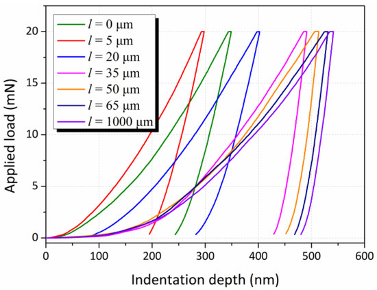 Figure 7. Nanoindentation load–displacement curves of the gas nitriding wheel specimen at different distances l from the top surface.