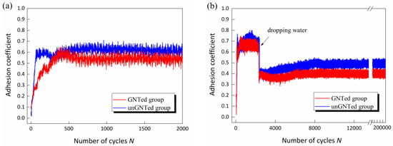 Figure 8 shows the time-varying curve of the adhesion coefficient with the number of cycles during the wheel–rail specimen rolling. Before N < 2 × 103, the rolling wear was performed in dry conditions, and the adhesion coefficient is shown in Figure 8a. It can be seen that the adhesion coefficient for the group without gas nitriding maintained a high value after about 50 cycles in the initial running-in stage, but the group with gas nitriding entered the dynamic stable stage after about 400 rolling cycles. This may be due to the fact that the white bright layer of the nitrided wheel specimen has a higher hardness than the base metal. Then, the rolling test was conducted under dropped water conditions after N > 2 × 103, and the time-varying curve of the adhesion coefficient for the whole rolling period is shown in Figure 8b. The results show that the adhesion coefficient presented a suddenly decrease after the water medium dropped onto the wheel and rail interface (see Figure 8b). In the steady stage, the average adhesion coefficients of the group without gas nitriding and the group with gas nitriding in the dry stage were 0.61 and 0.54, respectively. However, under the water lubrication condition, the average adhesion coefficient fell from 0.61 to 0.49 for the group without gas nitriding and it fell from 0.54 to 0.40 for the group with gas nitriding, respectively. Therefore, the gas nitriding on the wheel surface could reduce the adhesion coefficients between the wheel and rail interface by 11.7% (in dry conditions) and 18.4% (in water conditions). However, the gas nitriding on the wheel surface could still maintain a relatively high value of the adhesion coefficient between the wheel and rail, which helps to avoid the occurrence of the wheel slipping on the rail.