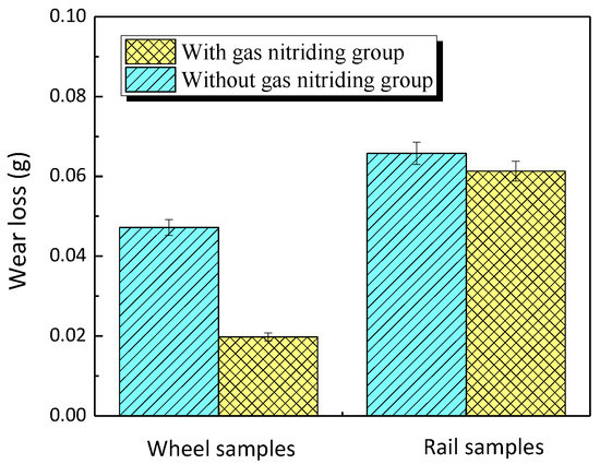 Comparing the wear amount of the groups with and without gas nitriding, it can be found that the wear loss of the wheel was significantly reduced after the gas nitriding, as shown in Figure 9. It is worth mentioning that the wear loss of the rail specimen which acted as the pair of tribo-pairs (without gas nitriding on the rail surface) also decreased; this is mainly because of the decrease in shear stress on the friction interface after the gas nitriding of friction pairs. As a result, the wear amount of the wheel and the rail decreased by 58.05% and 10.77%, respectively, and the total wear of the wheel–rail system decreased by approximately 30.66%. The above results show that the gas nitriding on the wheel specimen could reduce the wear loss of both the wheel and rail, and can effectively improve the wear resistance of the wheel and rail.