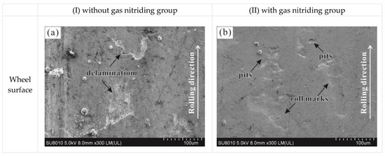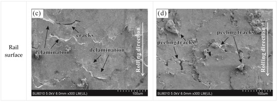 Figure 10 shows the local topography of the surface wear area of the wheel and rail specimen. It can be seen that the obvious characteristics of fatigue delamination presented on the wear surface of wheel specimen without gas nitriding (see Figure 10a). Meanwhile, severe delamination and surface fatigue cracking were observed obviously on its counterpart (namely the worn surface of the rail specimen)—see Figure 10c. Compared with the specimen without gas nitriding, only slightly roll marks and some pits were seen on the worn surface for the wheel with gas nitriding, and no obvious delamination appeared on the worn surface (see Figure 10b). On the wheel’s counterpart, more serious peeling tracks occurred throughout the worn surface of rail specimen, but the delamination phenomenon was not particularly obvious—see Figure 10d.
