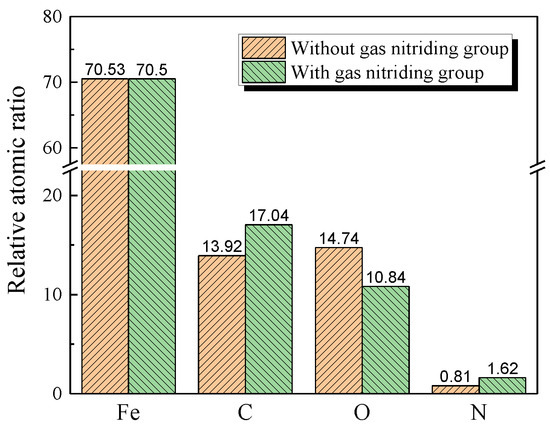 According to the detection results of EDX, it can be found from Figure 11 that the atomic ratio of nitrogen to oxygen on the worn surface in Figure 10b was obviously higher than that in Figure 10a. The reason for this is that the diffusion layer plays a key role in delaying the mechanical degradations such as wear and erosion. It is well known that the relationship between wear rate and hardness is consistent with the Archard wear equation, which suggests that wear rate decreases with the increased hardness [22]. Previous studies reported that the microhardness was improved significantly from 300 to 650 HV after gas nitriding due to the formation of iron nitrides such as Fe2-3N [18]. In addition, the frictional shear stress between the wheel and rail interface was significantly restrained by the gas nitriding on their surface, and thus the wear loss of the rail specimen was also reduced. Overall, the main wear mechanism was fatigue wear and adhesive wear for the group without gas nitriding, but the wear mechanism was mainly transformed into abrasive wear and oxidative wear for the group with gas nitriding.