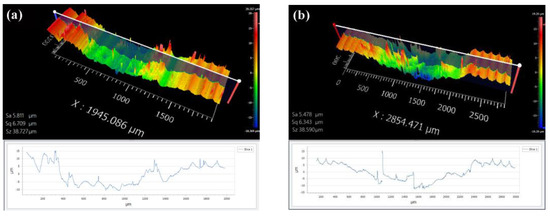 Figure 12. Three-dimensional surface profiles and 2D cross profiles of wear scars for the rail specimen: N = 2 × 105; (a) the group without gas nitriding; (b) the group with gas nitriding.