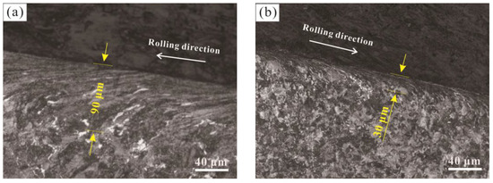 Figure 13. Optical microscope (OM) micrographs of plastic deformation in wear scar section for the wheel specimen: N = 2 × 103; (a) the group without gas nitriding; (b) the group with gas nitriding.