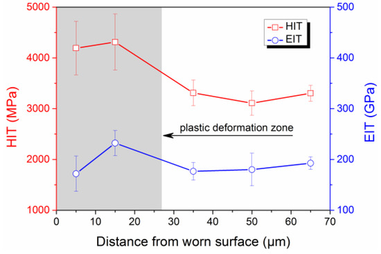 Figure 14. Nanoindentation hardness and elastic modulus values at different distances l from the worn surface corresponding to the cross-section of Figure 13b.