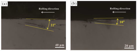 Figure 15 shows the fatigue crack distribution on the wear scar section for the wheel specimen. It can be found that many fatigue cracks were distributed along the rolling direction of the wheel specimen and propagated at different angles. It was indicated that the water significantly accelerates the growth of RCF cracks, since the medium trapped in the cracks helps to accelerate the propagation of cracks, which is consistent with previous studies [23]. More importantly, the gas nitriding on the wheel specimen changed the propagation behaviors of the fatigue cracks. As shown in Figure 15, the crack growth angle of the wheel without gas nitriding is larger than that of the wheel without gas nitriding, and the cracks in the wheel with gas nitriding mainly propagated in a direction parallel to the surface (see Figure 15b). Therefore, it is characterized by obvious fatigue delamination. However, the crack growth angle for the specimen without gas nitriding was quite large, and the maximum crack growth angle exceeded 22° (see Figure 15a). There is no doubt that the RCF life was markedly related to the subsurface crack propagation angle, thus a larger crack growth angle means a lower service life for the moving components.