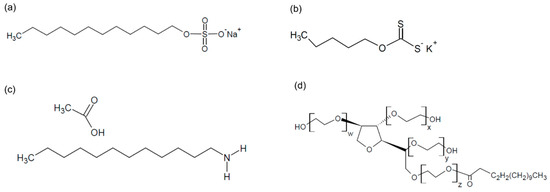 Potassium amyl xanthate (KAX) (Tokyo Chemical Industry Co., Ltd., Tokyo, Japan), kerosene (Wako Pure Chemical Industries, Ltd., Osaka, Japan), methyl isobutyl carbinol (MIBC) (Tokyo Chemical Industry Co., Ltd., Tokyo, Japan), sodium dodecyl sulfate (SDS) (Tokyo Chemical Industry Co., Ltd., Japan), dodecyl amine acetate (DAA) (Tokyo Chemical Industry Co., Ltd., Tokyo, Japan), and polysorbate 20 (Tween20) (Tokyo Chemical Industry Co., Ltd., Tokyo Japan) were used in this study. The chemical structures of the four emulsifiers (SDS, KAX, DAA, and Tween 20) used in this study are shown in Figure 1.