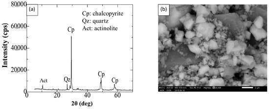 Chalcopyrite sample used in this study were characterized by XRF, XRD, SEM-EDX, and laser diffraction sizer. The chemical composition of the chalcopyrite sample (XRF) is shown in Table 1. Figure 2a,b shows the results of XRD and SEM-EDX analysis, respectively, of finely ground chalcopyrite. XRD analysis showed that the sample was mainly composed of chalcopyrite with minor amounts of actinolite (Ca2Mg3Fe2Si8O22(OH)2) and quartz. Figure 3 shows the particle size distributions of finely ground chalcopyrite (median particle diameter (D50) of 3.5 µm), which was used in this study.