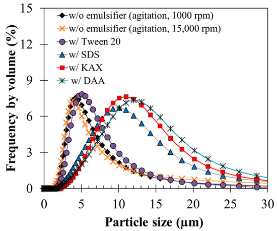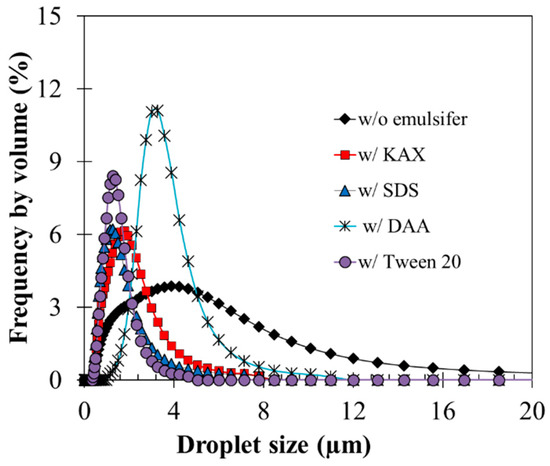 Anionic (SDS, KAX), cationic (DAA), and non-ionic (Tween 20) emulsifiers were used as emulsifying reagents. First, 10 mL of kerosene was mixed with 40 mL of deionized (DI) water, and then 0.1 g of the emulsifiers (SDS, KAX, DAA, or Tween 20) was added (i.e., concentration of emulsifiers, 2000 ppm). Emulsification of the mixture was then carried out before agglomeration using an ultrasonic homogenizer (ULTRA-TURRAX, IKA, Königswinter, Germany) for 60 s. After emulsification, oil droplet size was measured using laser diffraction.
