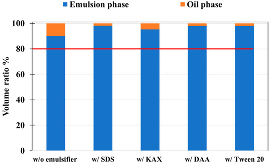Figure 5. Volume ratio of oil and emulsion layers with and without emulsifiers after emulsification and centrifugation. Note that the red line indicates volume ratio without emulsification (80% water, 20% oil).